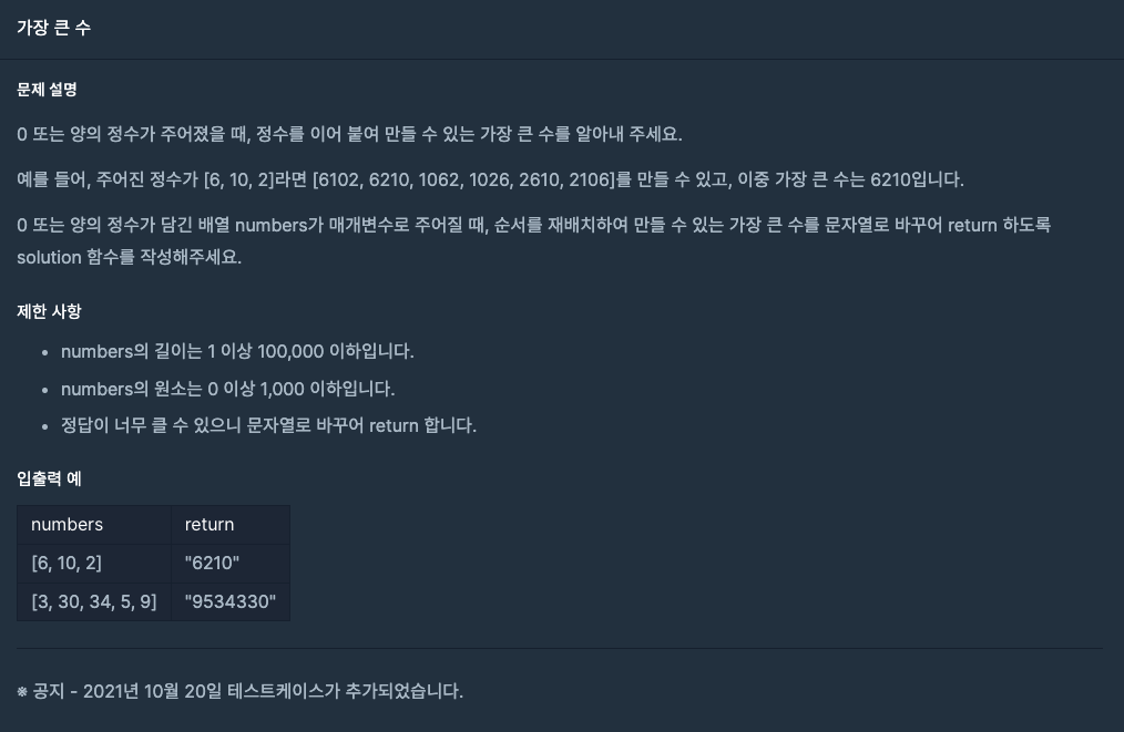 0 또는 양의 정수가 담긴 배열 numbers가 매개변수로 주어질 때, 순서를 재배치하여 만들 수 있는 가장 큰 수를 문자열로 바꾸어 return 하도록 solution 함수를 작성해주세요.