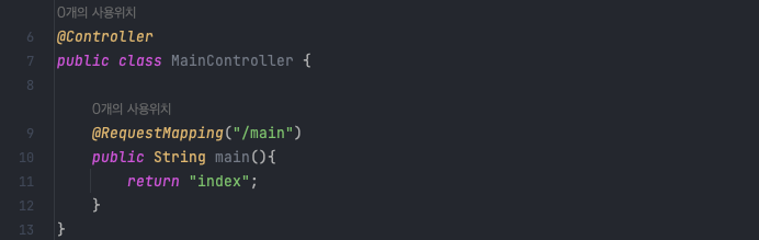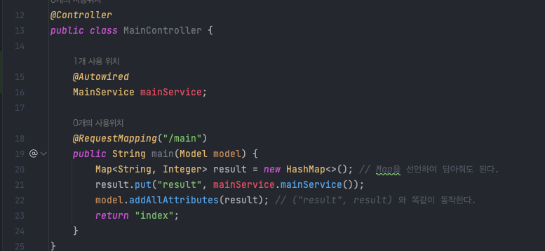 위 사진과 같이 컨트롤러에서 요청을 제일 먼저 받은 다음에 해당 요청에 대한 비지니스 로직을 수행하기 위해 MainService를 DI해주고 결과값을 받아 Model에 attribute한 다음 View를 전달하는걸 확인할 수 있다.