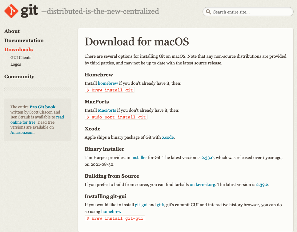 Download for macOS There are several options for installing Git on macOS. Note that any non-source distributions are provided by third parties, and may not be up to date with the latest source release. Homebrew Install homebrew if you don't already have it