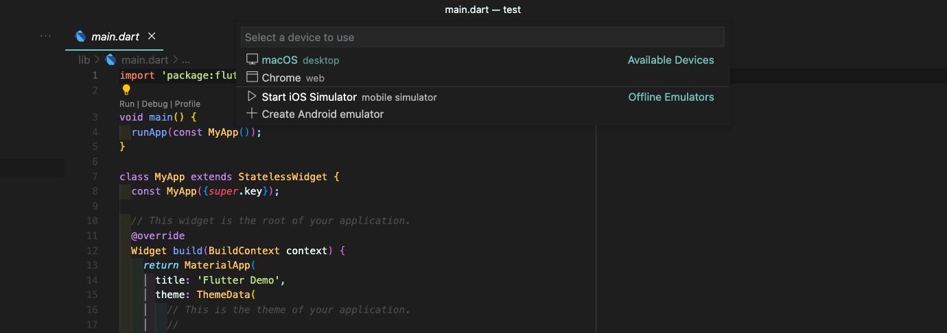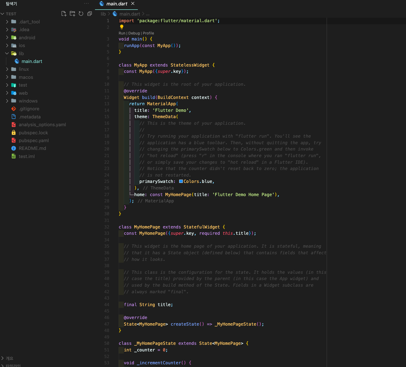 lib -> main.dart 파일을 열어보면 기본 코드가 있는걸 볼 수 있습니다. 일단 코드에 관한건 나중에 살펴보고 지금은 실행을 일단 해보겠습니다 :)