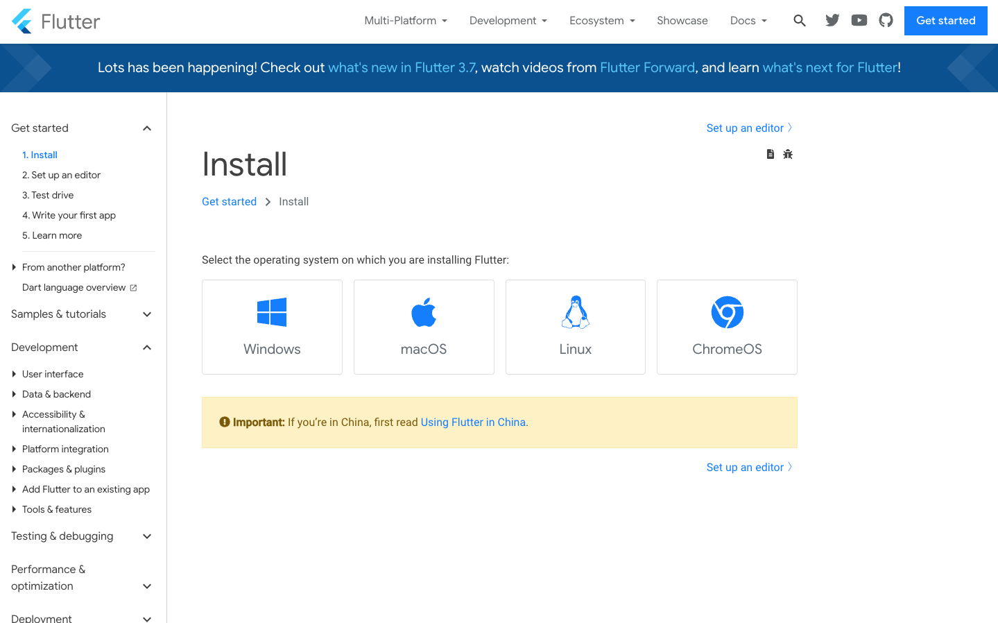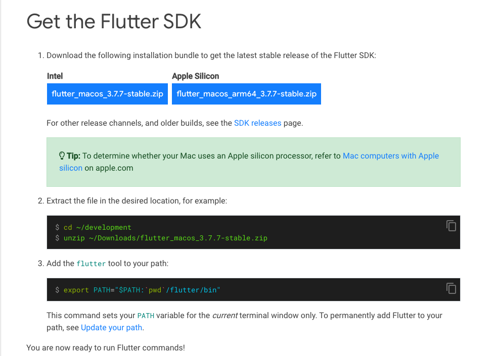 페이지 접속시 Flutter를 실행할 플랫폼에 따른 설치 방법들이 자세하게 나와있습니다.